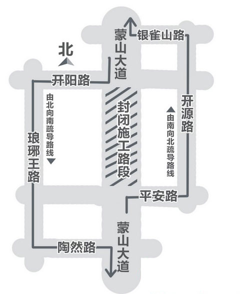为避免车辆绕行冲突造成拥堵,按照提前规划的疏导路线,由南向北车辆绕行路线:蒙山大道→平安路→开源路→银雀山路→蒙山大道;由北向南车辆绕行路线:蒙山大道→开阳路→琅琊王路→陶然路。