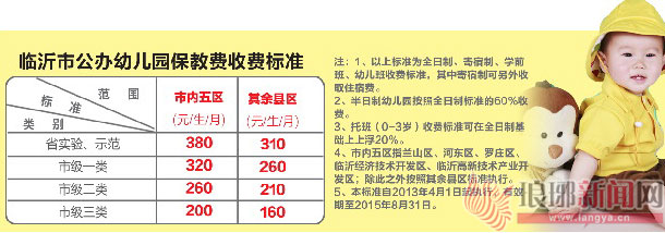 困扰广大幼儿家长的幼儿园收费名目繁多等问题,4月1日将正式终结。经历前期论证讨论稿、修改完善、临沂市政府批准,临沂版《幼儿园收费管理细则》日前已正式下发,将于下月起施行。细则明确将幼儿园收费统一为保教费、住宿费、服务性收费和代收费项目,叫停了除此以外的书本、取暖降温费和各色特长班等收费。