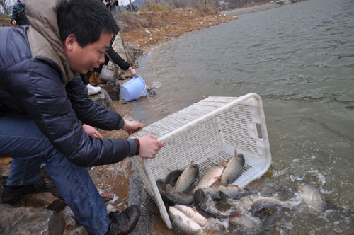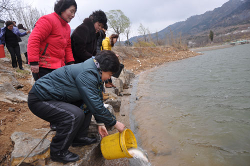 临沂网讯:3月30日(农历2月19日),细雨蒙蒙如丝,空气清新凉爽。临沭县观音阁释隆庆法师组织了殊胜的放生活动,以培养慈悲心的实际行动来庆祝观音菩萨的圣诞。爱心人士们先为230多斤水族及300多只鸟类祈福,然后驱车把它们送到生态环境良好的映翠湖一带放生。看到小鸟们脱出牢笼在天上自由地飞翔,鱼儿们在水中自在地游动,大家内心感到无比的舒畅和欢欣。