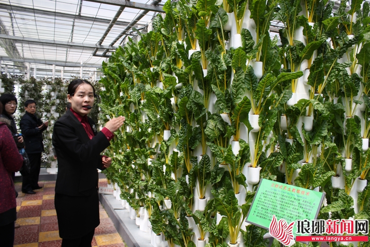 在苍山县现代农业示范园参观的客商在观看无土栽培的蔬菜。