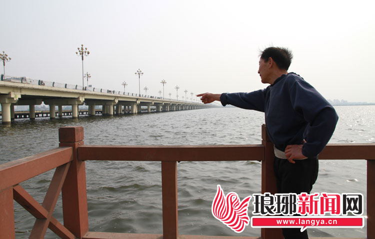 孟大爷手指女孩当时的漂浮位置。 记者 刘安琪 摄