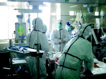 4月29日上午,专家组成员在重症监护室中,为我省首例人感染H7N9禽流感患者撤掉人工肺。