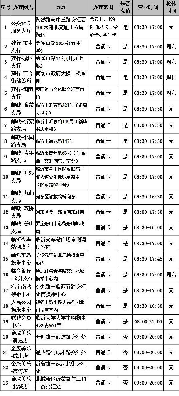 进一步方便市民购卡及充值,公交总公司在邮政局新增8处公交IC卡办理网点,分别为邮政-金蒙支局、沂蒙路支局 、北园路支局、青年路支局、西郊支局、九曲支局、双桥支局、册山支局。目前,临沂市公交IC卡办理网点已达到23处。