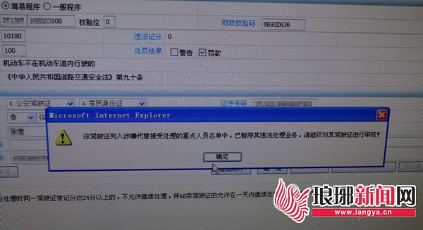 记者看到,当工作人员将驾驶证号或车辆号码输入到违法处理系统中时,系统弹出提示“该驾驶证列入涉嫌代替接受处理的重点人员名单中,已暂停其违法处理业务。请组织对其驾驶证进行审核!”