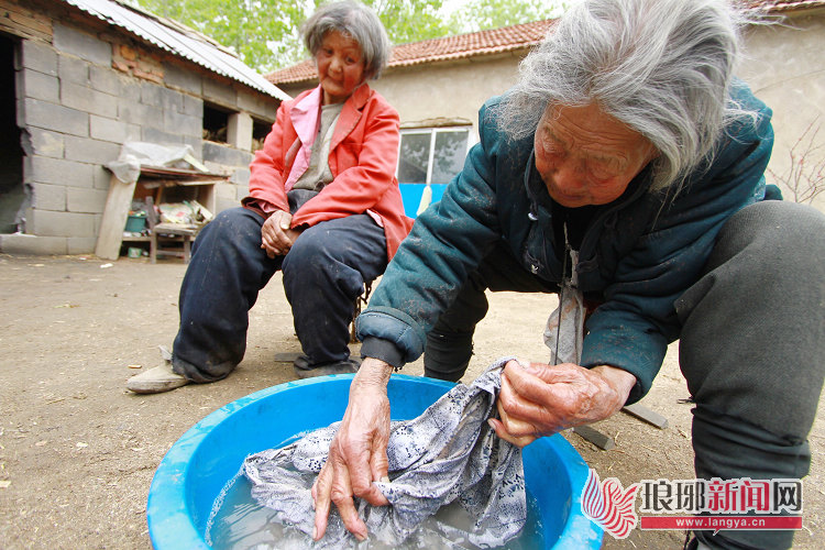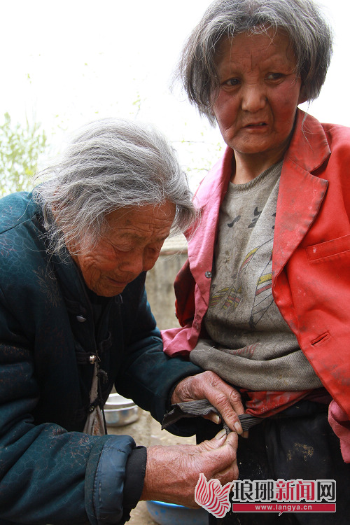 看到家里来了客人,王张氏在婆婆身后坐下。她两只手反复揪着破旧衣服的衣角,偶尔也会把一根手指放在嘴边,头微微向左侧着,眼睛低垂不敢看人,像个害羞的孩子。不过,花白的头发显示出了她的年纪,红色上衣在白发的映衬下显得很是鲜艳。