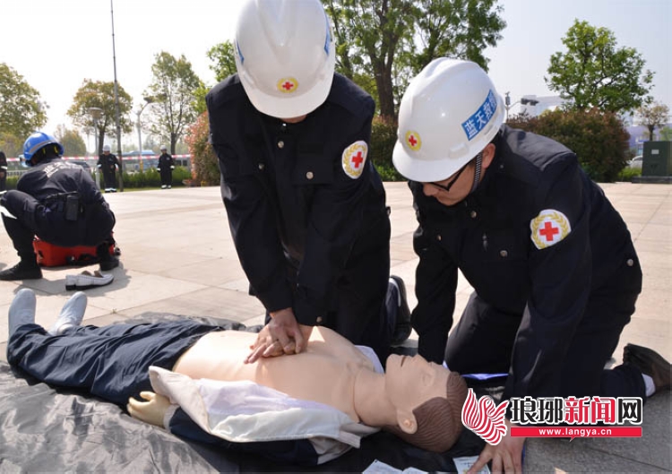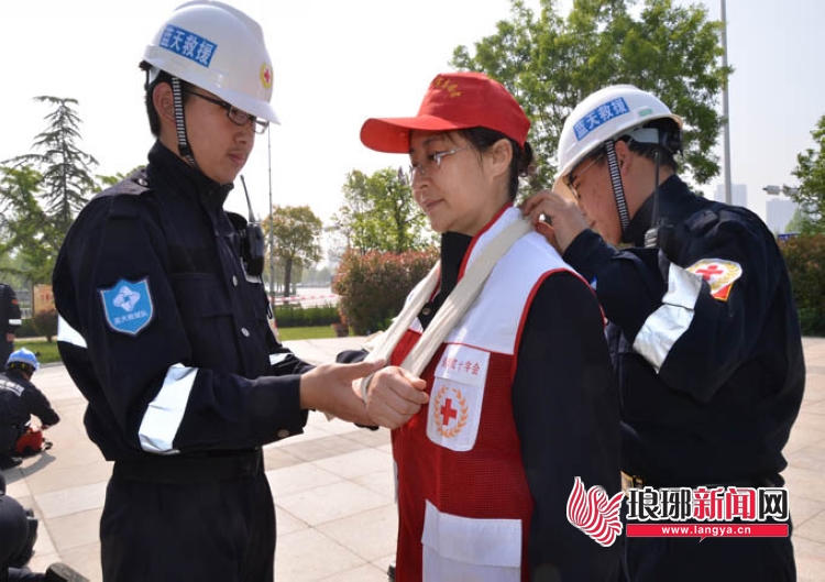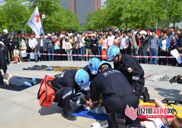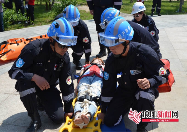 5月10日上午,临沂市红十字蓝天救援队在环保大厦前进行地震现场医疗救护演示。