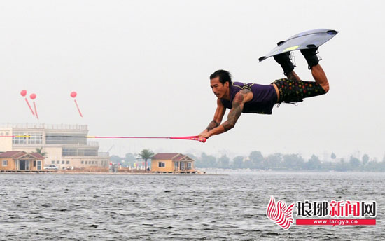 来自中国香港的滑水选手张豪龙上来一个帅气的超人飞动作亮相,引得观众席尖叫不已。