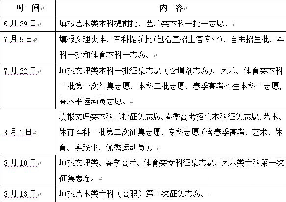 考生必须在规定时间内填报志愿,各批次志愿填报时间均在填报志愿当天9:00-17:00(艺术类专科批第二次征集志愿在8月13日9:00-12:00填报)。
