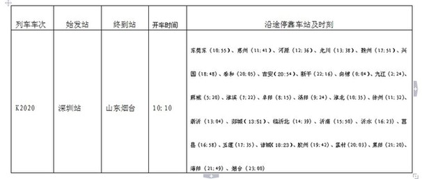 据介绍,7月1日起,新开行的深圳至烟台的K2020次快速列车,深圳站开车时间为上午10时10分,到达终点站山东烟台是次日23时00分,全程运行36小时50分,中途停靠东莞东、惠州、河源、龙川、赣州、吉安、九江、麻城、潢川、阜阳、徐州、临沂北、胶州、莱阳等车站。该趟列车的开行将同时改变深圳没有直接到达徐州、临沂北、胶州、莱阳等地列车的历史。