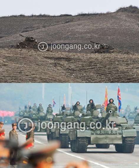 上图:据称是朝鲜用土堆、石块、木条建造的假坦克;下图:真正的朝鲜军坦克
