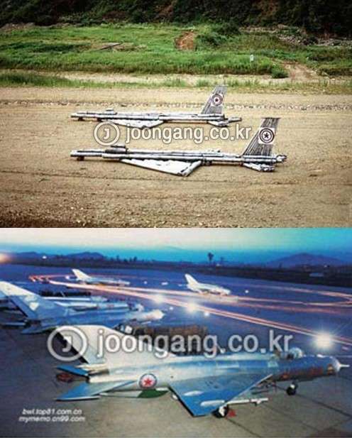 上图:据称是朝军部署的假战机,用柱子等做成模型;下图:真正的朝军米格战机