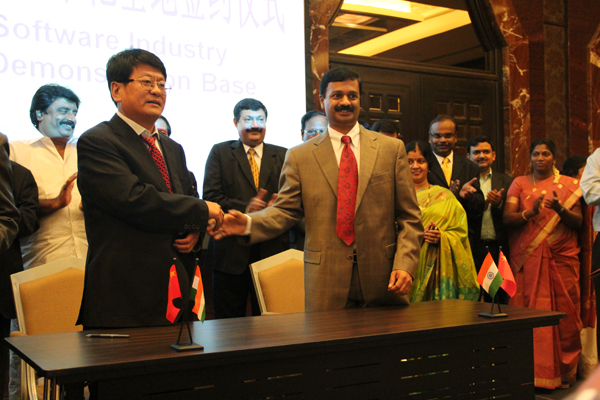 在会议上,公司总经理王岚保与SRM集团常务董事玛尼瓦纳、SRM集团首席执行官拉克西米签订“中印软件产业合作示范基地协议”和“中印高端人才合作协议”,并举行了隆重的国际(中印)贸易网开通仪式。