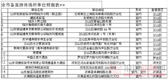记者从临沂市卫生监督所了解到,目前,临沂市经过备案的正规游泳场所共有15家,分布在兰山区、河东区、罗庄区以及沂南县四个县区。其中,3家为室外泳池。