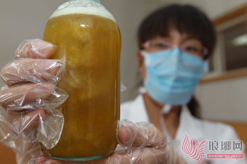 刘传美体内抽出的积水又稠又黄,还有大量飘浮物。