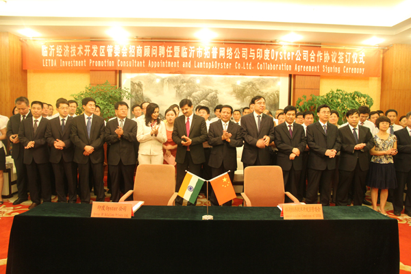 临沂网讯 2013年7月20日,“临沂经济技术开发区管委会招商顾问聘任暨临沂市拓普网络股份有限公司与印度Oyster公司合作协议签订仪式”在开发区会议室隆重举行。在仪式上,市人大常委会副主任、开发区党工委书记徐福田为Oyster公司总经理Anil Nagpal先生颁发招商顾问聘书,党工委副书记张雷与Anil Nagpal签订委托招商协议,公司总经理王岚保与Oyster公司总经理Anil Nagpal签订战略合作协议,开发区在家领导出席仪式。