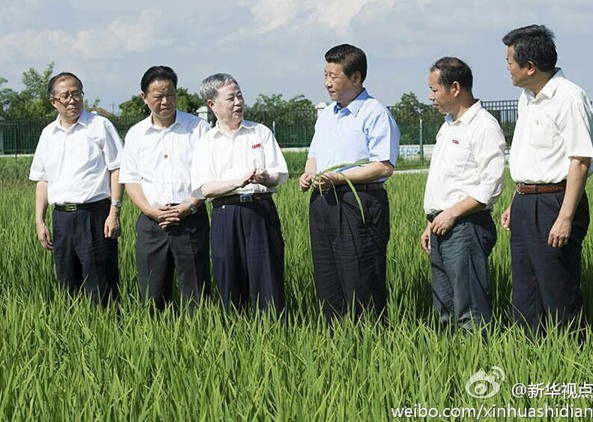 新华网北京7月22日电 据新华社新华视点微博报道,22日下午,习近平来到鄂州市鄂城区杜山镇东港村育种基地,拔起一棵稻苗察看分蘖情况,夸奖“很壮实”。听说武汉大学朱英国院士负责培育的杂交稻良种累计推广亿亩以上,总书记说,您辛苦了,感谢你们作的贡献,希望继续努力。粮食安全要靠自己。