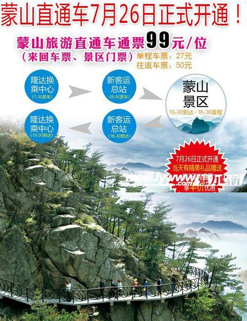 “到蒙山有了旅游直通车,既方便又经济”。据了解,“蒙山旅游直通车”是今年蒙山旅游区拓展客源市场的一项实质性举措,旨在“搅热”蒙山旅游区黄金旅游通道。临沂汽车站至蒙山旅游直通车将于7月26日正式开通。开通初期,蒙山旅游直通车每天一班,当天往返,出发时间:早7:30分从临沂隆达换乘中心直接发车,经新客运总站后,8:00驶出总站上高速直达蒙山景区,下午4:30从蒙山景区返回隆达换乘中心再到隆达换乘中心。车票门票通票99元/人,其中单程车票27元/位,往返车票50元/位。当天有精美礼品赠送,前7日购通票享半价优惠。