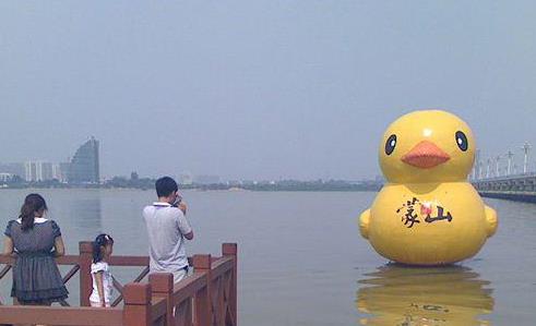据了解,这只“大黄鸭”高6米,宽5米,总重85公斤,是由蒙山旅游区为景区推介宣传而制作的,计划在滨河景区内三处景点进行投放,这是先期投放的第一只。“大黄鸭”的到来为滨河景区增添了亮点,为市民提供了一处特色观光点。