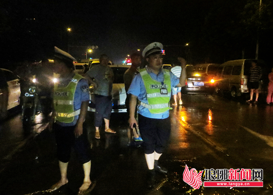 1日晚8点,交警们浸泡在雨水中,疏散车辆