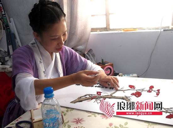 石梅告诉记者,她正在为几个民间文化艺术展准备自己的作品,“我要不断地制作新的作品、高水平的作品参加展出。”石梅放下手中的剪刀,给记者介绍桌子上正在制作中的作品,“这幅作品是《红叶白鸠》,准备参加北京的一个民间艺术展,另外几幅作品是为咱临沂的书圣文化节准备的。”为了能起到更好的宣传效果,石梅还特意制作了一套汉服。