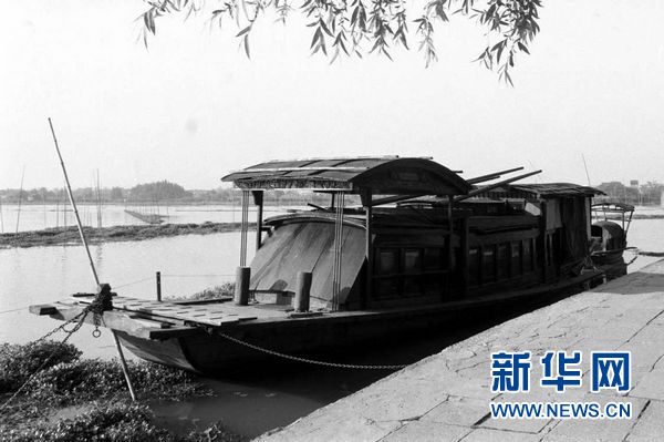 由于会场受到外国巡捕搜查和暗探的注意,一大代表李达的夫人王会悟安排代表们陆续转移到浙江嘉兴,在南湖的一艘游船上召开了最后一天的会议。这是按当年画舫仿造的游船,停在南湖上供游人瞻仰(资料照片)。新华社发