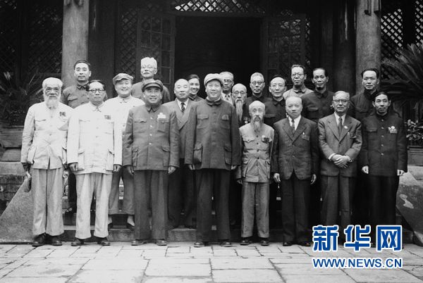 1949年1月22日,到达解放区的各民主党派、各人民团体、无党派民主人士的代表李济深、沈钧儒、马叙伦、郭沫若、谭平山等55人,联名发表声明,坚决支持毛泽东14日声明关于和谈的八项条件。55人声明公开表明各民主党派一致承认中国共产党的领导地位,与“中间路线”彻底决裂的立场,为共同筹建新中国打下了重要的政治基础。这是毛泽东等与各民主党派、各人民团体、无党派民主人士的代表合影。新华社发