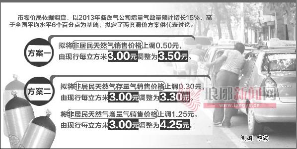 如果按照方案中车用天然气销售价格每立方上调0.5元算,调整后的车用天然气将达到每立方4.3元,如果是单班出租车,每天用气量大约100元左右,按照每年工作10个月算,合计上涨4000元;如果夫妻俩轮班开出租,每天加气费140元,算起来全年就得多花5400元,如果是两班倒多付出的燃气费就更多了,每年至少要多花6000元加气。