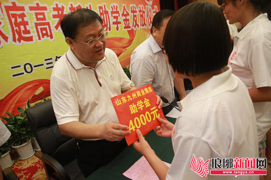 “感谢九州集团伸出援助之手,否则我不得不放弃读大学的机会。”15日上午,贫困学生杨景祥在拿到九州商业集团资助的四千元助学金后,流下了感动的泪水。在2013年高考中,杨景祥以657分考入武汉大学,但是家庭的贫困让他打算放弃学业,九州商业集团圆了他的大学梦。而今天像杨景祥这样,受九州集团资助而圆大学梦的寒门学子还有99人。