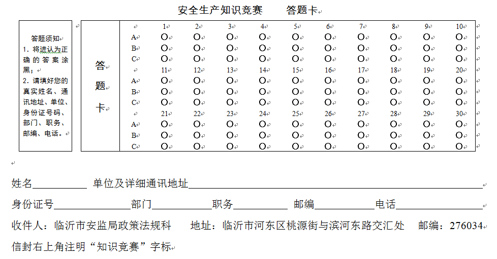 为了提高广大群众的安全意识,营造浓厚的安全氛围,扎实推进第十个“安全生产月”活动的顺利开展,特举办此次全市安全生产知识竞赛。竞赛组委会从全答对者中抽取30名人员进行奖励,每人发放奖金100元。参加答题活动需将题目答案按要求填写在答题卡中,并将答题卡邮寄至临沂市安全生产知识竞赛组委会,联系方式见答题卡。