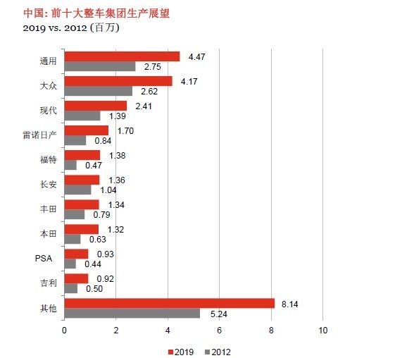 在普华永道预测2019年中国前十大整车生产集团时,它将长安、吉利两大中国品牌分别排在第六、第十位。“长城汽车近来增长很快,但它的总体规模仍受到限制;比亚迪的长项在于电动汽车领域,电动汽车的推广面临诸多困难,包括关键技术的突破和基础设施建设等,我们不认为电动汽车市场在2020年前将出现爆发式增长,”廖仲敏说。