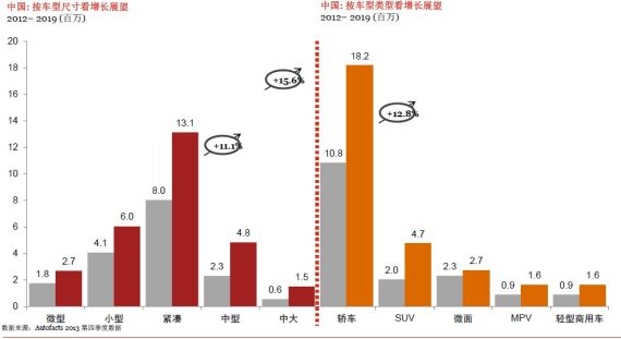 普华永道认为,从车辆类型看,2012~2019年间,SUV将维持以往的高增长,成为产销增幅最大的细分市场车型,它是产量将从200万辆增长到470万辆;轿车产量也将实现较大增长,从1080万辆增长到1820万辆。