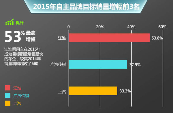 入围2015目标销量增幅榜单前3名的品牌分别是:江淮、广汽传祺、上汽。若仔细分析这3家企业间的共性,有一点不得不提,那就是都有一款在售或即将推出(名爵锐腾)的拳头产品来支撑整体销量。以江淮为例,去年8月份上市的小型SUV瑞风S3在短短的4个月内总计销量超过5万辆,如此给力的市场表现也给了江淮足够的理由去继续开拓这一细分市场。值得一提的是,上述3大自主品牌的2015年目标销量增速远远高于如一汽丰田与一汽大众奥迪这样的合资品牌。