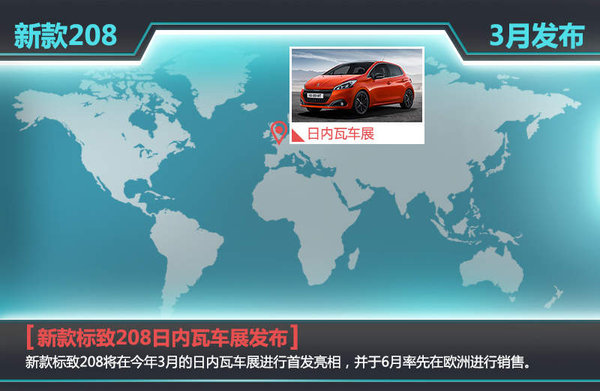 新款标致208将在今年3月的日内瓦车展进行首发亮相,并于6月率先在欧洲进行销售。随后,该车有望在2016年投放到中国市场。除了标准版本以外,新款标致208还拓展出GT Line和GTi by Peugeot Sport两款衍生车型。有了特殊车型的助阵,更为丰富的产品家族,将使新款标致208在同级别车型当中具有更大的竞争优势。