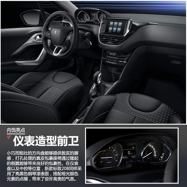 新款标致208内饰设计与同门现售的小型SUV标致2008有着异曲同工之处。在标致i-Cockpit设计理念的指导之下,新车的内饰动感时尚又不失实用性。除入门车型外,新款标致208配备了7英寸中控触摸屏,具备音响控制、蓝牙电话、倒车影像、导航等功能。小巧而粗壮的方向盘能够提供敦实的握感,局部进行打孔处理的真皮包裹座椅通过隆起的侧翼能够带来良好的包裹性。在仪表盘以及中控等位置,新款标致208同样采用了亮黑色钢琴漆表面,搭配哑光银色元素的点缀,给车内空间带来了些许高贵的气息。