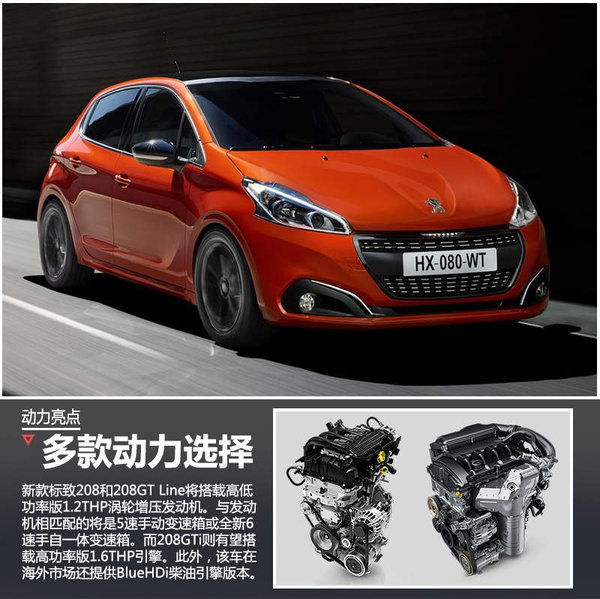 新款标致208达到了欧洲最新的欧VI排放标准。在动力方面,新款标致208和208GT Line将搭载高低功率版1.2THP涡轮增压发动机,其最大功率分别为82kW和100kW,峰值扭矩分别达到195Nm和230Nm。与发动机相匹配的将是5速手动变速箱或全新6速手自一体变速箱。而208GTi则有望搭载高功率版1.6THP引擎,其最大功率高达147kW,峰值扭矩为275Nm。此外,新款标致208还将在海外市场提供搭载1.6升BlueHDi柴油引擎的版本。
