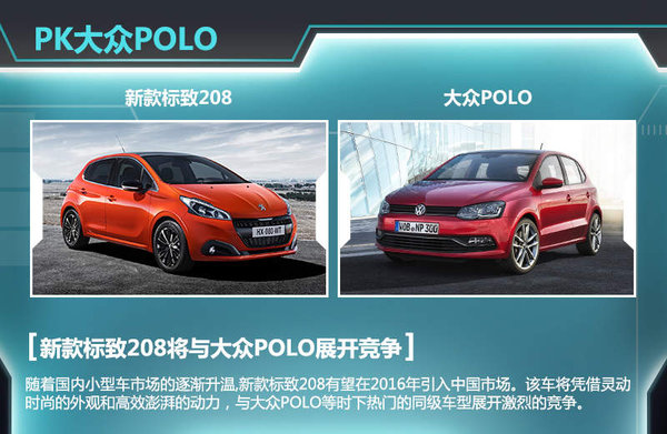 上市三年以来,标致208在欧洲市场的反响不错。但是反观国内市场会发现,标致品牌暂停了其两厢入门级小型车的引进脚步,转而以标致301这样的入门级三厢车来抢占市场。全新的造型设计与先进的动力总成,让标致208有了“脱胎换骨”的变化。随着国内小型车市场的逐渐升温,新款标致208有望在2016年引入中国市场。该车一经推出,将凭借灵动时尚的外观和高效澎湃的动力,与大众POLO等时下热门的同级车型展开激烈的竞争。