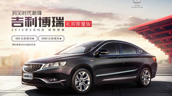 日前,吉利汽车官方宣布,为庆祝吉利博瑞成为外事礼宾专用车,吉利汽车将于3月16日率先推出礼宾限量版,届时,吉利将携手京东商城、苏宁易购、天猫三大电商平台全面启动网络预售,并公布该限量版车型售价,新车将限量1000辆。