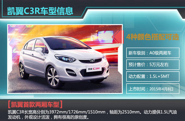 奇瑞旗下全新品牌凯翼汽车于去年8月28日正式发布,在推出首款三厢轿车凯翼C3之后,又计划针对细分市场推出两厢车凯翼C3R。近日,网通社从凯翼汽车官方得到了新车的相关技术参数,在动力总成方面,凯翼C3R搭载全新调校的1.5L自然吸气发动机和5速手动变速器。值得一提的是,凯翼C3R的燃油经济性十分出众,综合油耗仅为5.6L,排放标准为国五。