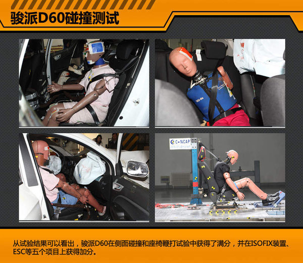 从试验结果可以看出,骏派D60在侧面碰撞和座椅鞭打试验中获得了满分,并在ISOFIX装置、ESC等五个项目上获得加分。