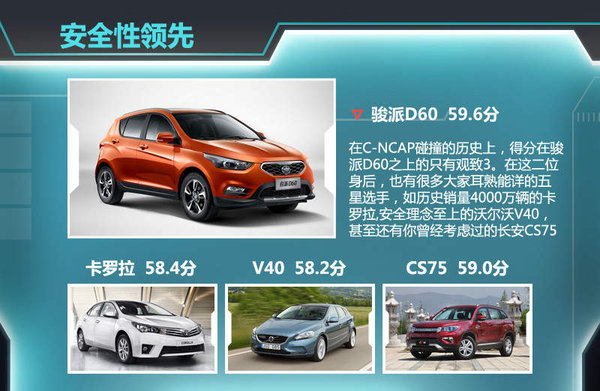 这样的概念至今仍深植于国人心中——安全性和车型的售价、定位有关,而且合资品牌的安全性要远超自主品牌。4月23日,中国汽车技术研究中心公布了2015年度C-NCAP第一批车型评价结果,骏派D60得分59.6分,在取得C-NCAP“五星”安全评价的同时,成为了历年所有SUV中得分第一的车型,成绩在C-NCAP历史上排名第二。这样的结果,打破了国人高售价等于高安全性的理念。