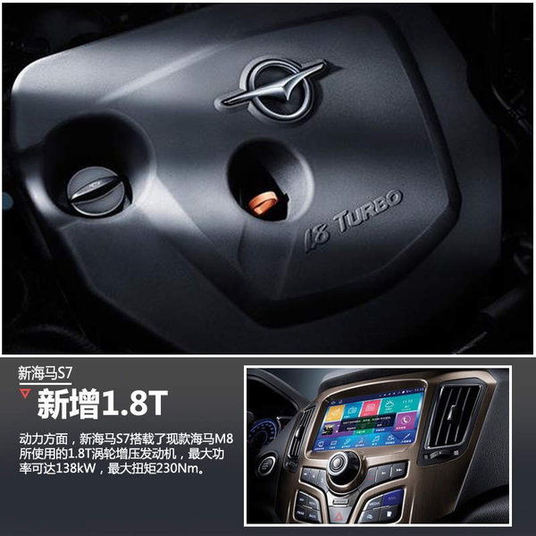 新海马S7则搭载了现款海马M8所使用的1.8T涡轮增压发动机。据了解,这款发动机采用了双顶置凸轮轴(DOHC)、可变气门正时系统、多点电喷、铝合金缸盖、高刚性缸体等一系列先进技术,具有高性能、低油耗和低排放、轻量化以及NVH优化四大核心优势。数据显示,其最大功率可达138kW,最大扭矩230Nm,与之匹配的传动系统则有望为5速手动或6速自动两种形式的变速箱。