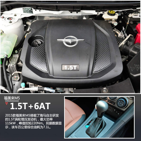 动力方面,2015款福美来M5搭载了海马自主研发的1.5T涡轮增压发动机,其最大功率115kW/rpm,峰值扭矩220Nm/1800-4000rpm,领先于同排量的奇瑞艾瑞泽7和荣威350等同级对手。对于一款10万元上下的家用车来说,这样的表现可以令人满意。