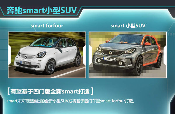 smart将推出的SUV车型预计将定位在小型SUV市场,并将基于该品牌最新推出的四门车型forfour打造。新车在外观设计上沿用了全新一代smart的设计风格,前大灯采用更大尺寸的灯组设计,配备U型LED日间行车灯。进气格栅的位置较现款车型有所提高、尺寸更大,并采用与车身配色反差较大的颜色,前脸视觉效果具有跳跃感,而转向灯独立在大灯下方。保险杠采用更为立体的凹凸式设计,内嵌下部进气口,而进气口两侧设置有雾灯。同时更高的离地间隙,也增强了新车型的通过性。