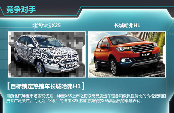 绅宝X25上市之初将会把目标锁定到热销车哈弗H1上。目前北汽绅宝市场表现优秀,绅宝X65上市之初以高品质造车理念和极具性价比的价格受到消费者广泛关注。而同为“X系”的绅宝X25也将继续保持X65高品质的卓越表现。届时,绅宝品牌阵容将进一步完善,征战日益激烈的SUV市场。
