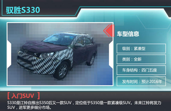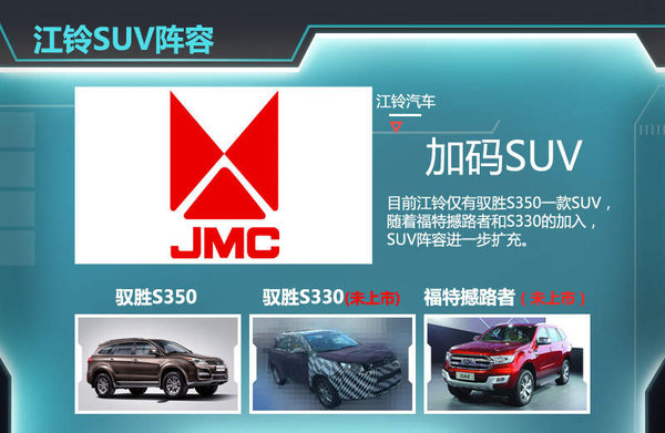 2010年,江铃推出其进军乘用车市场的首款车型——驭胜S550。据江铃汽车披露,在投放市场四年当中,根据上牌数量,驭胜S350在中型自主SUV细分市场位居第二。在上海车展,江铃汽车提出2022年百万年销量目标,仅商用车的市场容量显然难以支撑起江铃百万辆目标。江铃汽车高层表示:“在乘用车领域,我们会做很多事情,尤其是在SUV市场。”未来江铃将以SUV为突破口,除了今年即将在江铃渠道发布上市的福特撼路者。江铃自主研发的入门SUV——S330很快也将与消费者见面。