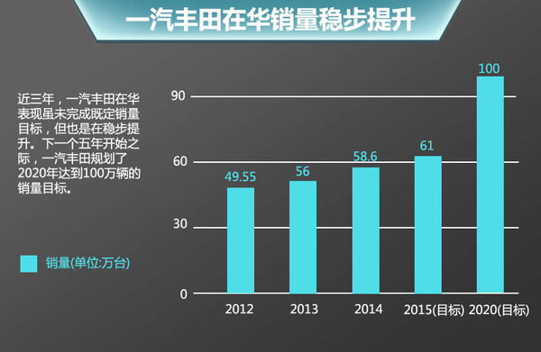 近三年,一汽丰田在华表现虽未完成既定销量目标,但也是在稳步提升。2012年,以49.55万辆的成绩收官;2013年,一汽丰田最终完成了56万辆。去年则是实现了销售58.61万辆。从2015年开始,一汽丰田将步入新的开始,今年销量目标定在了61万台。同时下一个五年开始之际,一汽丰田规划了2020年达到100万辆的销量目标。随着一汽丰田新车型的加速导入,其品牌竞争力将会得到进一步提升,完成销量目标指日可待。