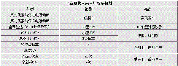 据了解,北京现代2015年下半年继全新途胜之后还将推出4款新车,分别为第九代索纳塔油电混动版、改款全新胜达2.0T、ix25 1.6T和名图1.6T。这4款车型全部属于北京现代的“D+S”战略车型,包含小型SUV、中型SUV和两款B级轿车(中高级车型),它们将与上半年上市的第九代索纳塔和刚刚上市的全新途胜一道为北京现代完成“D+S”车型销量占比达50%的目标贡献力量,此外第九代索纳塔插电混动版的引入将使得北京现代新能源产品阵容得到壮大,而北京现代第五工厂(重庆工厂)未来投产的全新A0级车以及A级车将与“D+S”形成补充,为其产品序列添砖加瓦。