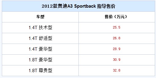 昨日,一汽-大众奥迪官方宣布2012款奥迪A3 Sportback正式上市。据悉,新款A3 Sportback增加了1.4T技术型,其他车型仅是外观与配置方面进行调整。整体售价约为25.5万-32.8万元。