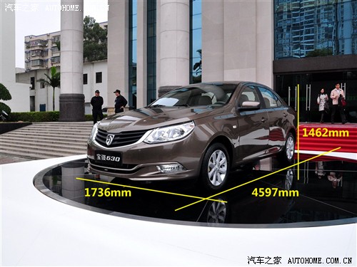 车身尺寸:宝骏630的整车尺寸为4597*1736*1462(mm),轴距为2640mm,标准的紧凑型车。2640mm轴距可以带来良好的后排腿部空间,数据也处于同级车的中上水平,有一定的优势。