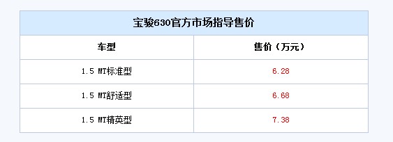 2011年8月9日,上海通用五菱宝骏宣布宝骏630正式在国内上市,此次上市一共有3款车型,售价区间为6.28-7.38万元,详细车型售价请见下表: